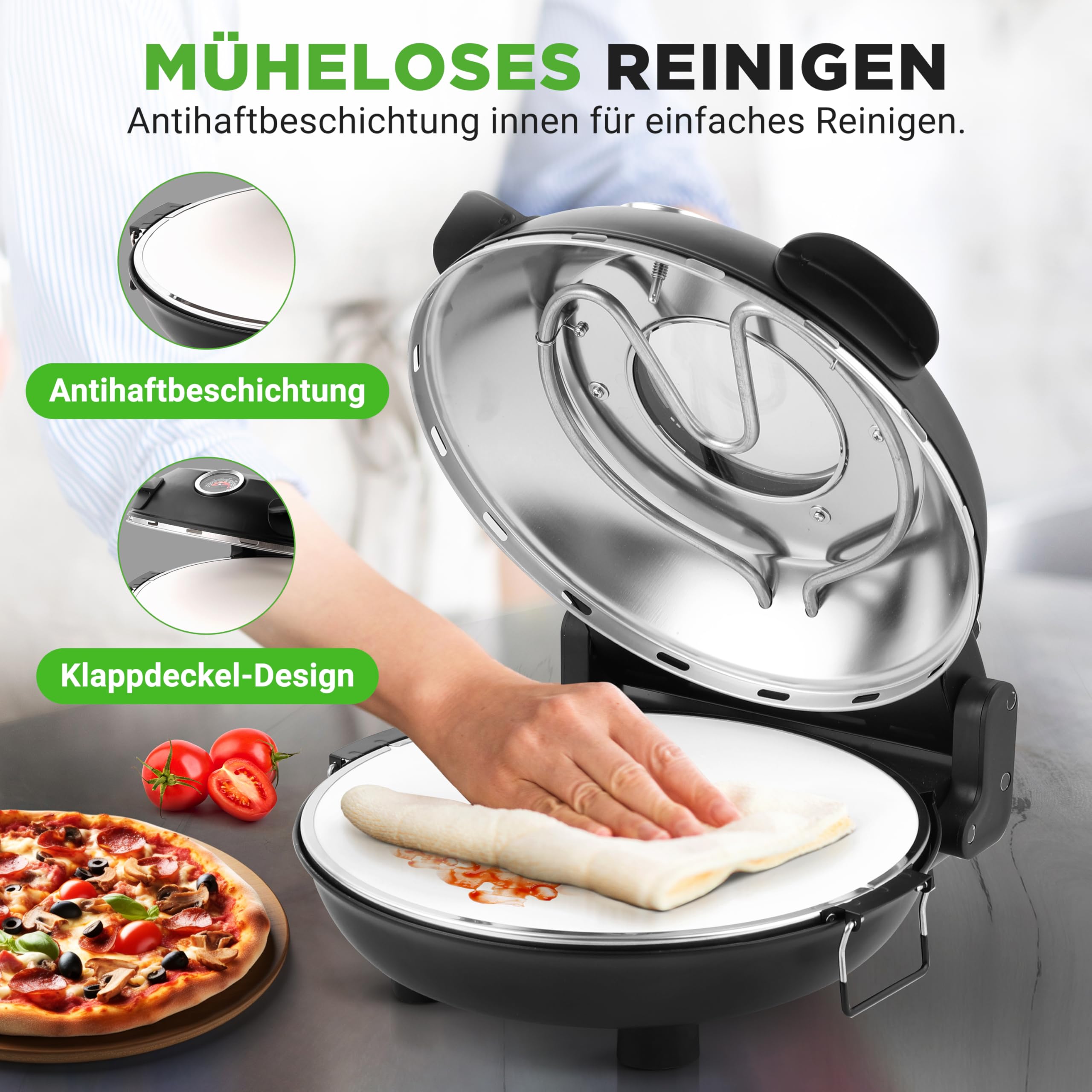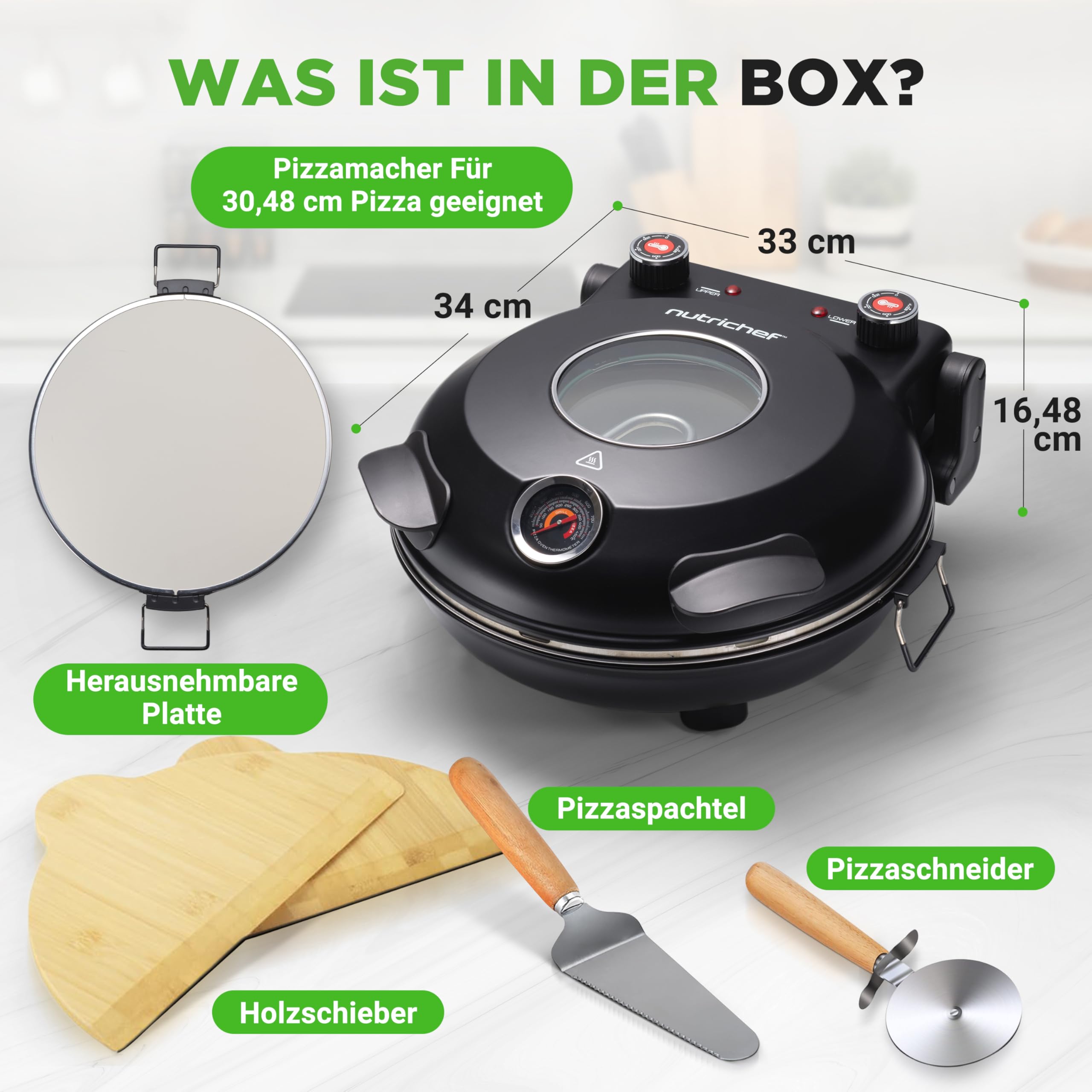 NutriChef Elektrischer Pizzaofen, 30,5 cm Arbeitsplatte, mit Temperaturkontrolle und Thermometer, Sichtfenster für präzises Kochen, Erhitzen bis zu 800 F, Antihaftstein, Schwarz